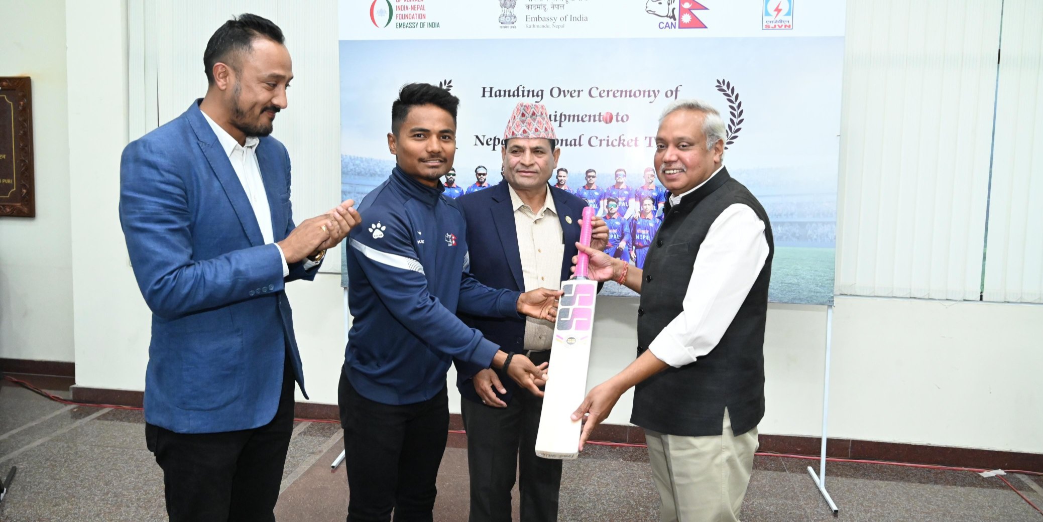 नेपाल स्थित भारतीय दूतावासले नेपाली क्रिकेट टिमलाई २० वटा क्रिकेट ब्याट सहयोग गरेको छ। नेपालका लागि भारतीय राजदूत नवीन श्रीवास्तवले सो ब्याट नेपाली क्रिकेट टिमका कप्तान रोहित पौडेललाई हस्तान्तरण गरेका हुन्।