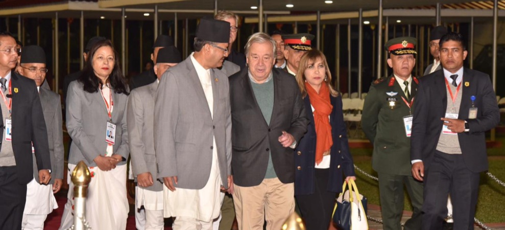 संयुक्त राष्ट्रसंघ (यूएन) का महासचिव एन्टोनियो गुटेरेस चारदिने भ्रमणका क्रममा नेपाल आइपुगेका छन् । आइतबार राती १ बजे उनी नेपाल आइपुग्दा त्रिभुवन अन्तर्राष्ट्रिय विमानस्थलमा परराष्ट्रमन्त्री एनपी साउदले स्वागत गरे ।
